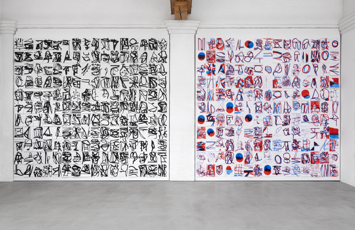 Mit graphischen Strukturen, Kürzeln und Notaten entstehen umfassende Bildsysteme und raumgreifende All-over-Strukturen, die das KunstHaus temporär verwandeln werden. Linien, Kürzel und Codes sind geradezu haptisch und mit eindringlicher Präsenz zu erfahren.