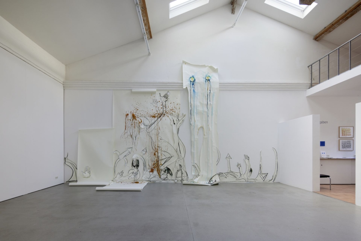 Für die Ausstellung „Poseidon lacht!“ entwirft Lottje vor Ort eine einzigartige, monumentale und zugleich fragile Wandarbeit. Durch ihre Technik, eine Zeichnung aus einem einzigen Strich zu entwickeln, werden in den Linien emotionale Vorgänge sichtbar: Gestaltungswille, Unsicherheit, Orientierungssuche und Forschheit bilden sich gleichermaßen ab und erscheinen, von Hand ausgeführt, als sichtbare Verflechtungen zur Videoarbeit „Ausnahmezustand“.