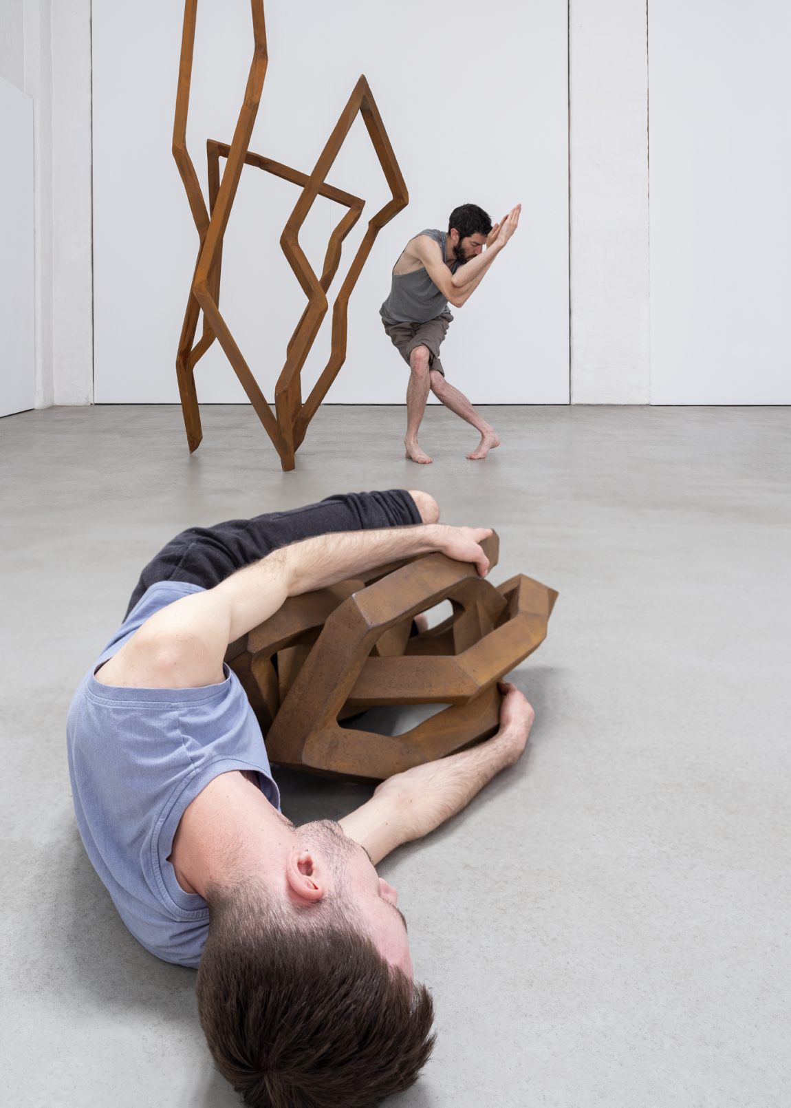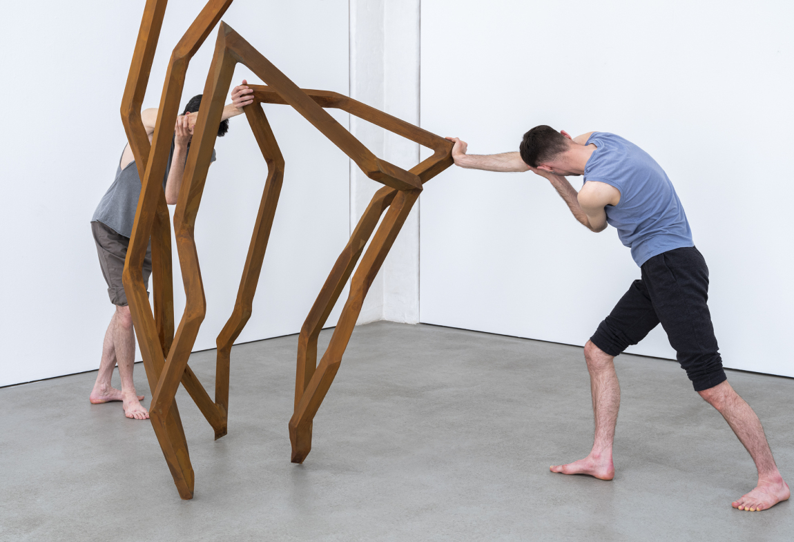 Die beiden Tänzer finden in Double Portrait ihre Verlängerung im Körper des jeweils anderen. Mit ihren Bewegungen reagieren sie auf Schads skulpturale Werke. In wechselnden Interdependenzen entsteht so ein gemeinsamer Raum. Die Skulpturen scheinen trotz konstruktiver Starre in Bewegung, trotz physischer Schwere vom Boden abheben zu wollen. Demgegenüber entfaltet sich die körperliche Bewegung der Tänzer, die die Starre auflöst, auf Bewegungsimpulse der Skulpturen reagiert und sie an den Raum weitergibt. Die Choreografie Double Portrait ist eine Produktion von Isabelle Schad, koproduziert vom HAU Hebbel am Ufer Berlin und defacto Zagreb.
