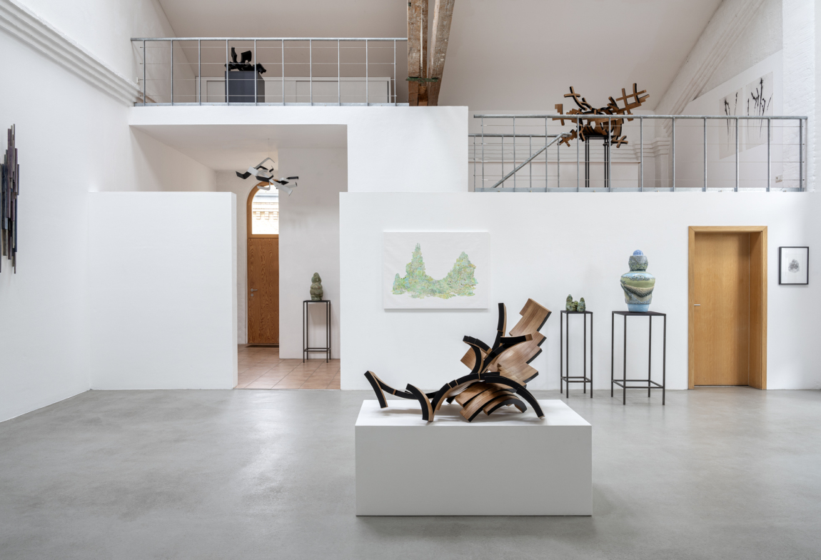 Zeichnungen. Hierzu wirken die feingliedrigen, vertikal strukturierten skulpturalen Werke von Kavata Mbiti aus kantigen Holzstäben im Zusammenspiel mit ihren großformatigen, so poetischen wie expressiven Papierarbeiten, wie ein richtungsweisender Kontrast. Die Einschnitte, Faltungen und Biegungen von Jan Großmann erkunden in freien Formationen und klaren Farbkontrasten den Raum, während die Skulpturen und Reliefarbeiten von Axel Anklam mit ihren diffizilen Oberflächenreizen, transparent oder spiegelnd, den Raum mit scheinbar schwereloser Leichtigkeit aufnehmen und das Licht als wandlungsfähigen Komplizen einbinden.